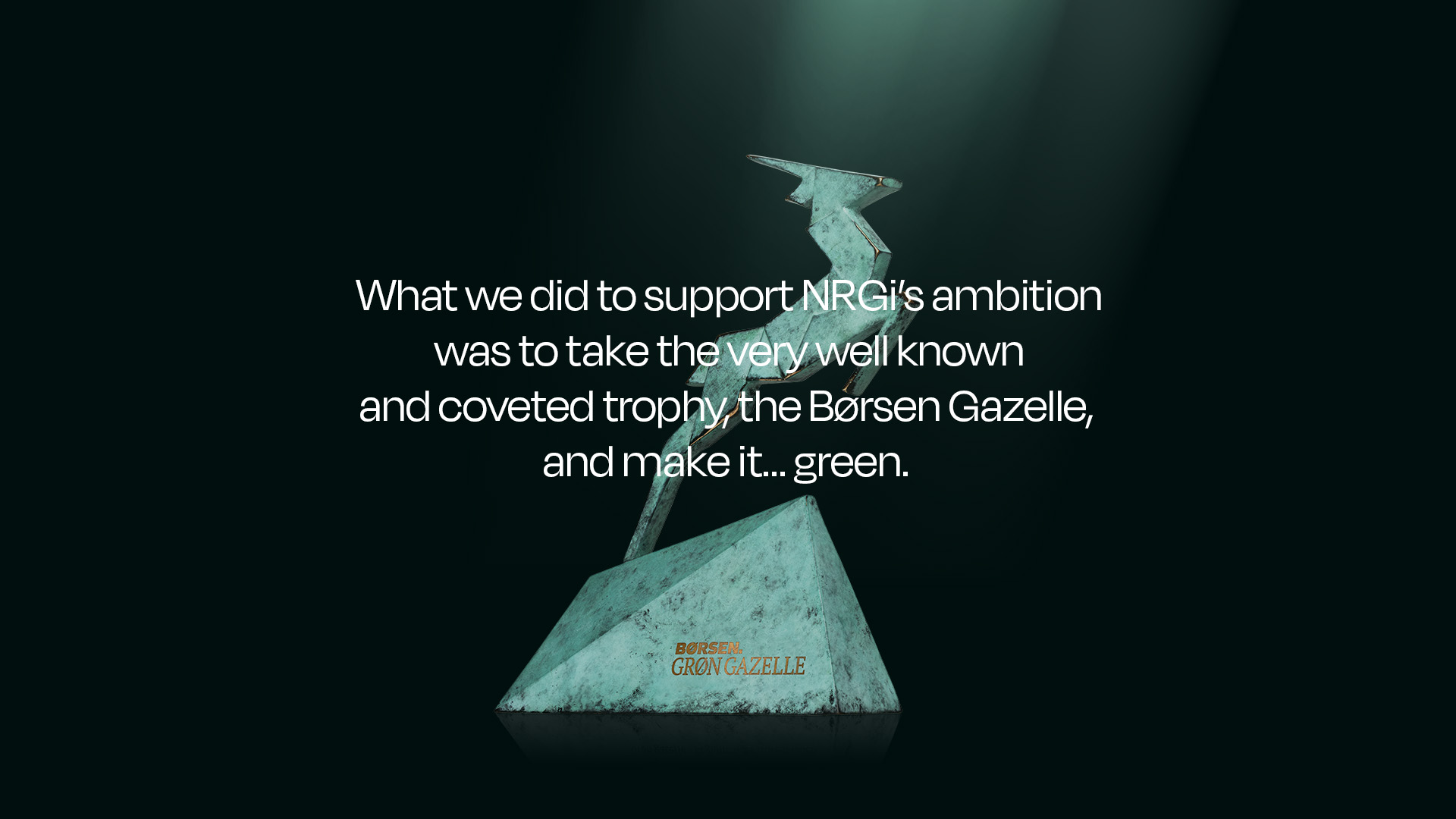 What we didto support NRGi’s ambition was to take the very well-known and coveted trophy,the Børsen Gazelle, and make it…green. Introducing The Børsen Green Gazelle – anew award, honoring Gazelle winners who demonstrate measurable, sustainable actions.No vague promises or lofty ambitions. Just hard evidence of progress.